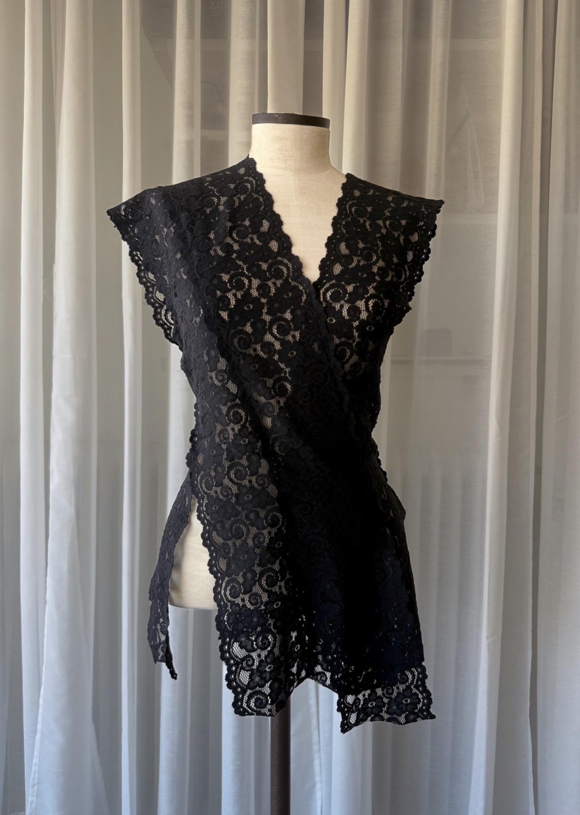 Asymmetric top made from elastic lace panels. Designed with a tilted neckline, raw edges, and slits at the front and back.